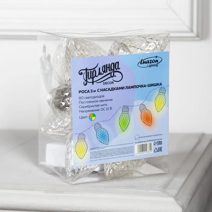 Гирлянда «Нить» 3 м с насадками «Лампочки шишки», IP20, прозрачная нить, 80 LED, свечение мульти, 8 режимов, 220 В — Характеристики