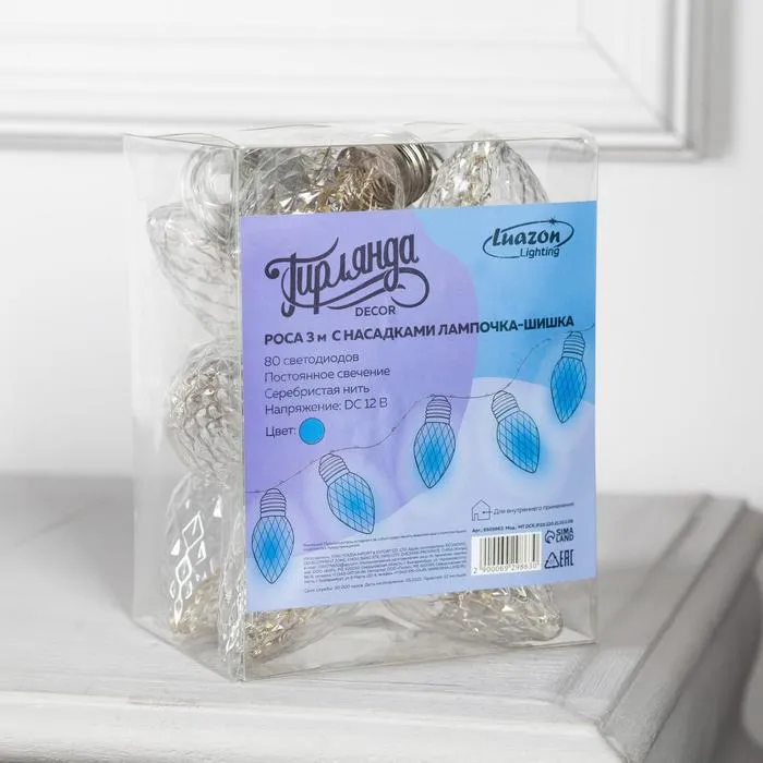 Гирлянда «Нить» 3 м с насадками «Лампочки шишки», IP20, прозрачная нить, 80 LED, свечение синее, 8 режимов, 220 В — Характеристики