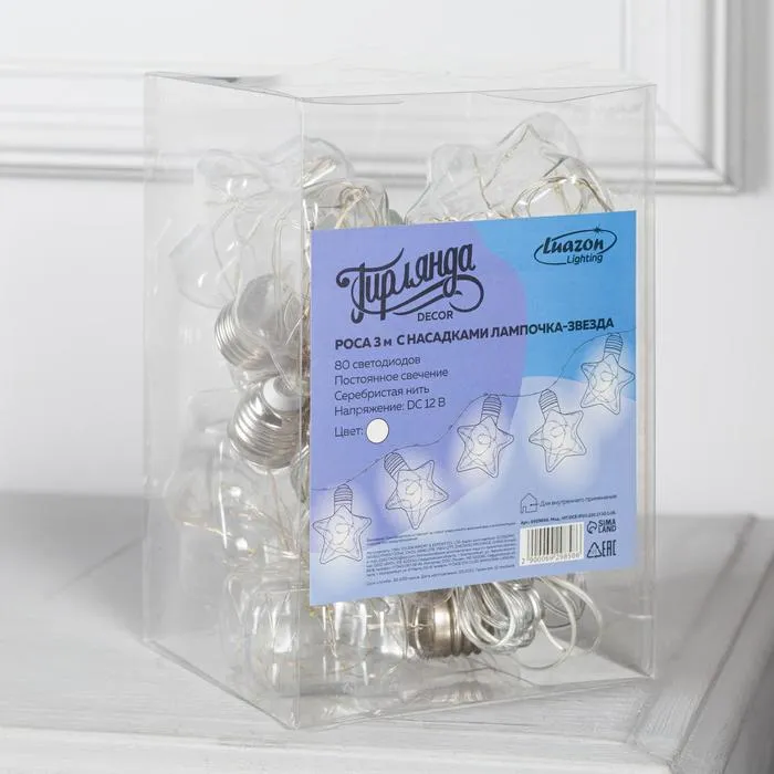 Гирлянда «Нить» 3 м с насадками «Лампочки звездочки», IP20, прозрачная нить, 80 LED, свечение белое, 8 режимов, 220 В — Характеристики