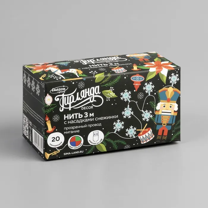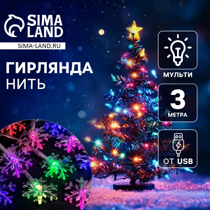Гирлянда «Нить» 3 м с насадками «Снежинки большие», IP20, прозрачная нить, 20 LED, свечение мульти (RG/RB), мигание, USB — Характеристики