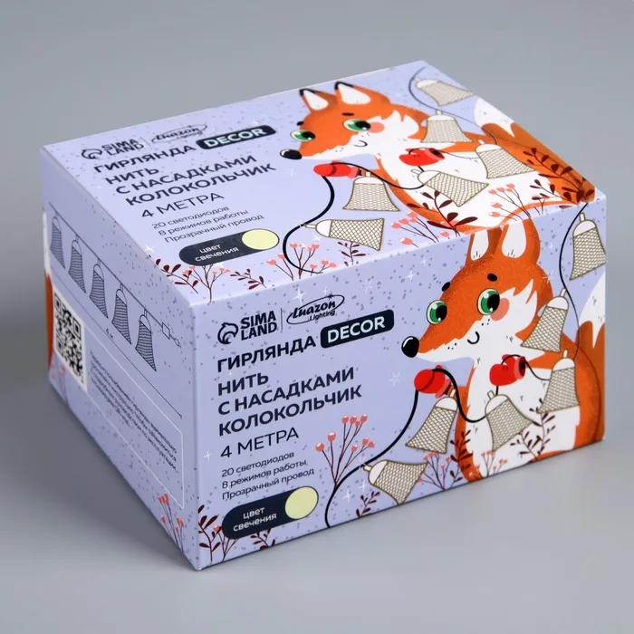 Гирлянда «Нить» 4 м с насадками «Колокольчик», IP20, прозрачная нить, 20 LED, свечение тёплое белое, 8 режимов, 220 В — Характеристики