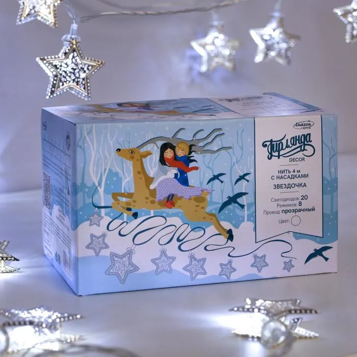 Гирлянда «Нить» 4 м с насадками «Звёздочка», IP20, прозрачная нить, 20 LED, свечение белое, 8 режимов, 220 В — Характеристики