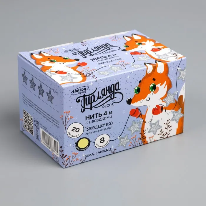 Гирлянда «Нить» 4 м с насадками «Звёздочка», IP20, прозрачная нить, 20 LED, свечение тёплое белое, 8 режимов, 220 В — Характеристики