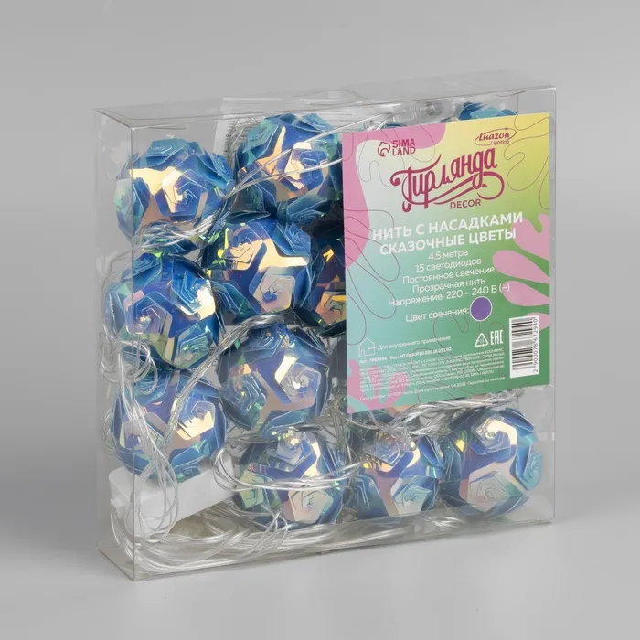 Гирлянда «Нить» 4.5 м с насадками «Цветочные шары», IP20, прозрачная нить, 15 LED, свечение фиолетовое, 220 В — Характеристики