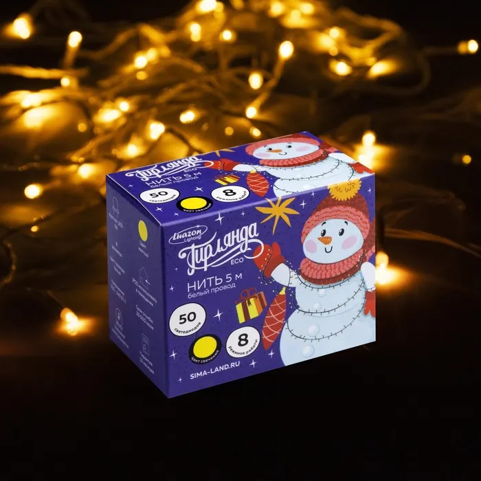 Гирлянда «Нить» 5 м, IP20, белая нить, 50 LED, 8 режимов, 220 В, свечение жёлтое — Характеристики