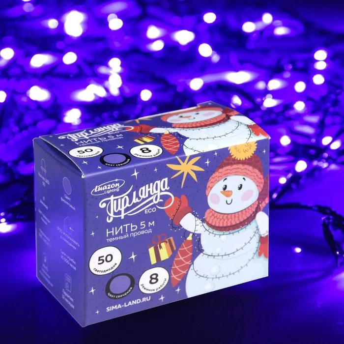 Гирлянда «Нить» 5 м, IP20, тёмная нить, 50 LED, свечение фиолетовое, 8 режимов, 220 В — Характеристики