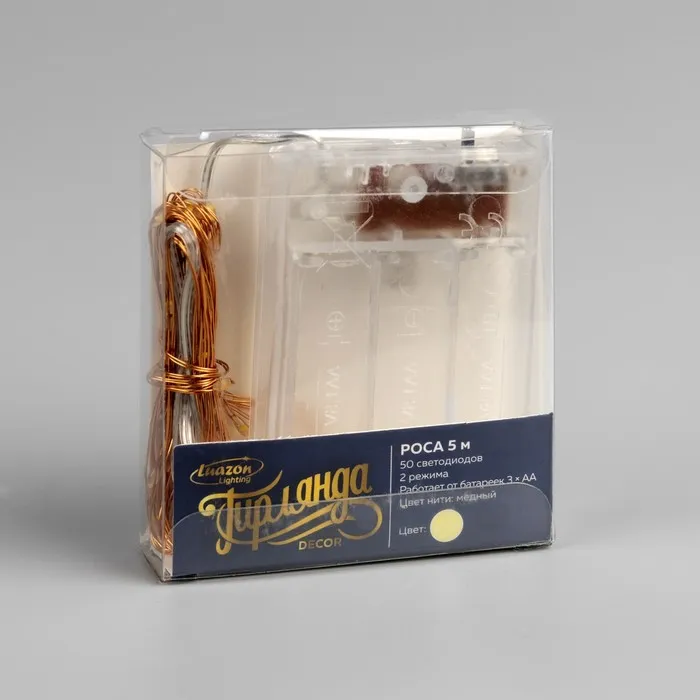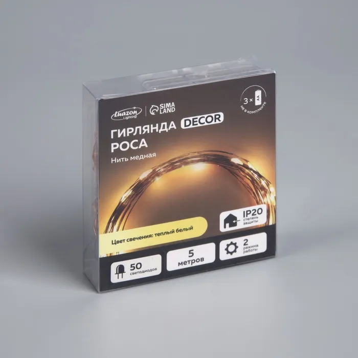 Гирлянда «Нить» 5 м роса, IP20, медная нить, 50 LED, свечение тёплое белое, 2 режима, AAх3 — Характеристики
