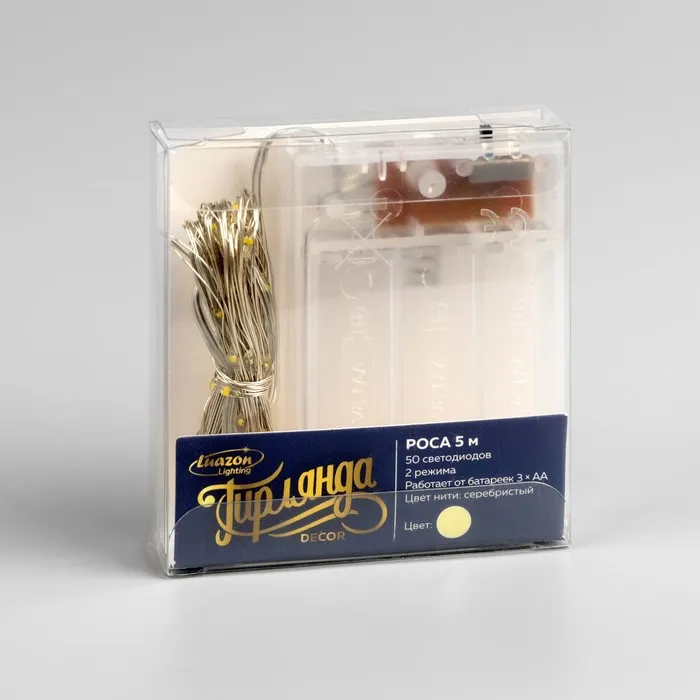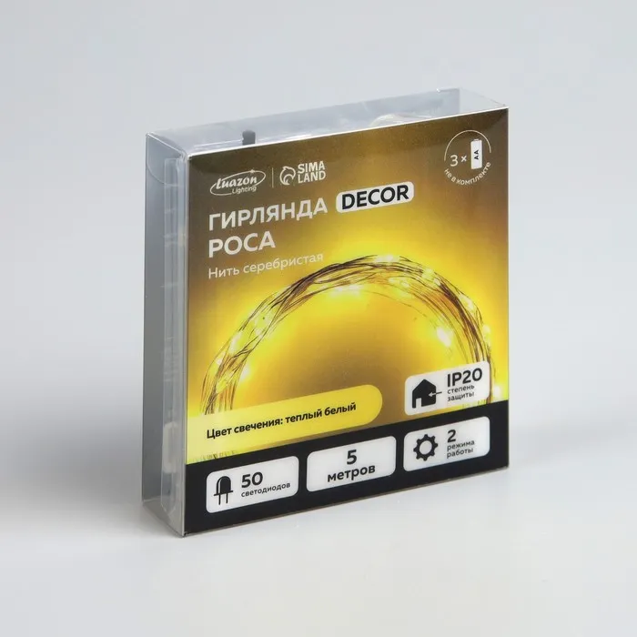 Гирлянда «Нить» 5 м роса, IP20, серебристая нить, 50 LED, 2 режима, батарейки AAх3 (не в комплекте), свечение тёплое белое — Характеристики