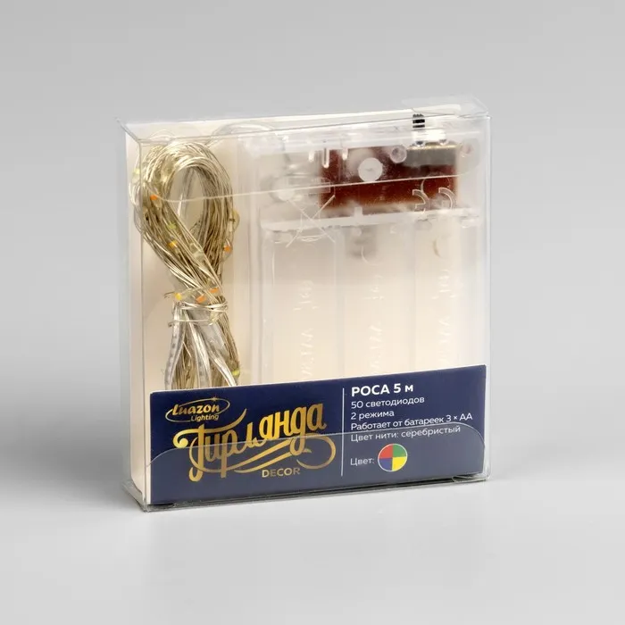 Гирлянда «Нить» 5 м роса, IP20, серебристая нить, 50 LED, 2 режима, батарейки AAх3 (нет в комплекте), свечение мульти — Характеристики