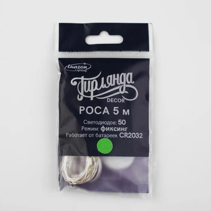 Гирлянда «Нить» 5 м роса, IP20, серебристая нить, 50 LED, батарейки CR2032х2 (в комплекте), свечение зелёное — Характеристики