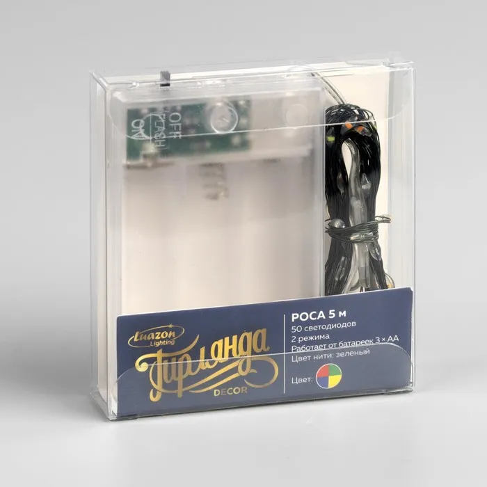 Гирлянда «Нить» 5 м роса, IP20, зелёная нить, 50 LED, 2 режима, батарейки AAх3 (нет в комплекте), свечение мульти — Характеристики
