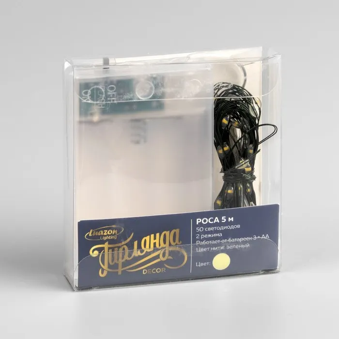 Гирлянда «Нить» 5 м роса, IP20, зелёная нить, 50 LED, 2 режима, батарейки AAх3 (нет в комплекте), свечение тёплое белое — Характеристики