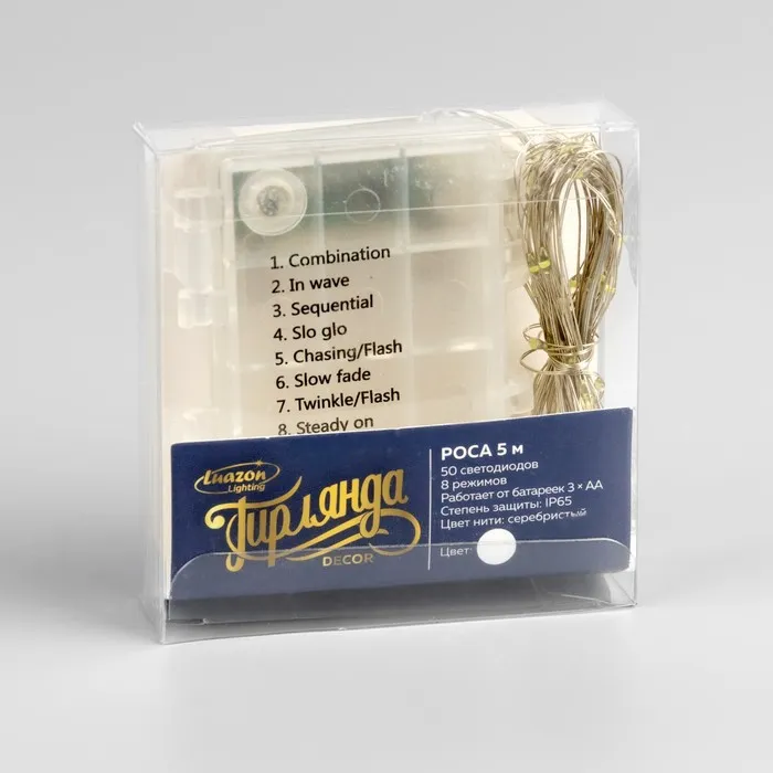 Гирлянда «Нить» 5 м роса, IP65, серебристая нить, 50 LED, 8 режимов, батарейки AAх3 (нет в комплекте), свечение белое — Характеристики