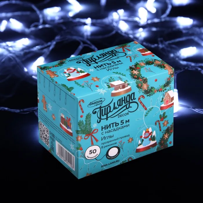 Гирлянда «Нить» 5 м с насадками «Игла», IP20, прозрачная нить, 50 LED, свечение белое, 8 режимов, 220 В — Характеристики