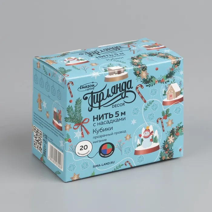 Гирлянда «Нить» 5 м с насадками «Кубики», IP20, прозрачная нить, 20 LED, свечение мульти (RG/RB), мигание, 220 В — Характеристики