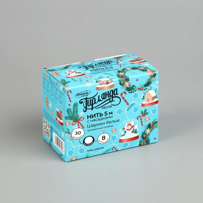 Гирлянда «Нить» 5 м с насадками «Шарики белые», IP20, прозрачная нить, 30 LED, свечение белое, 8 режимов, 220 В — Характеристики
