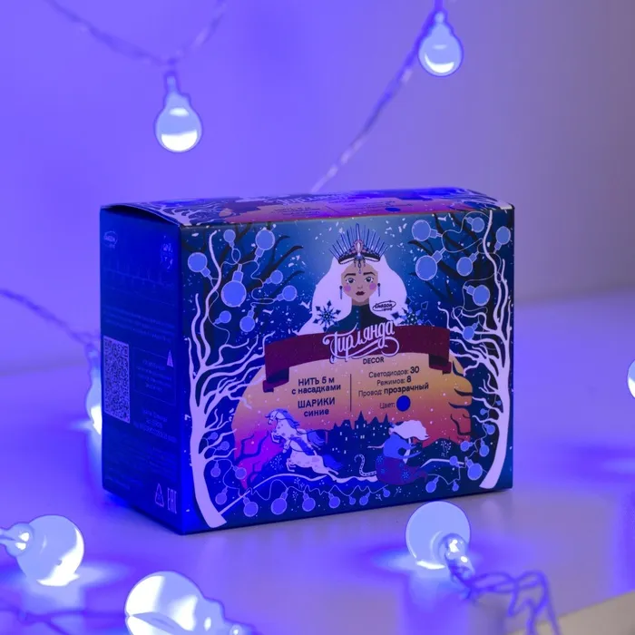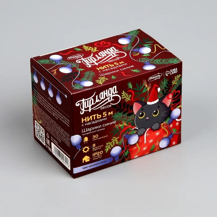 Гирлянда «Нить» 5 м с насадками «Шарики синие», IP20, прозрачная нить, 30 LED, свечение синее, 8 режимов, 220 В — Характеристики