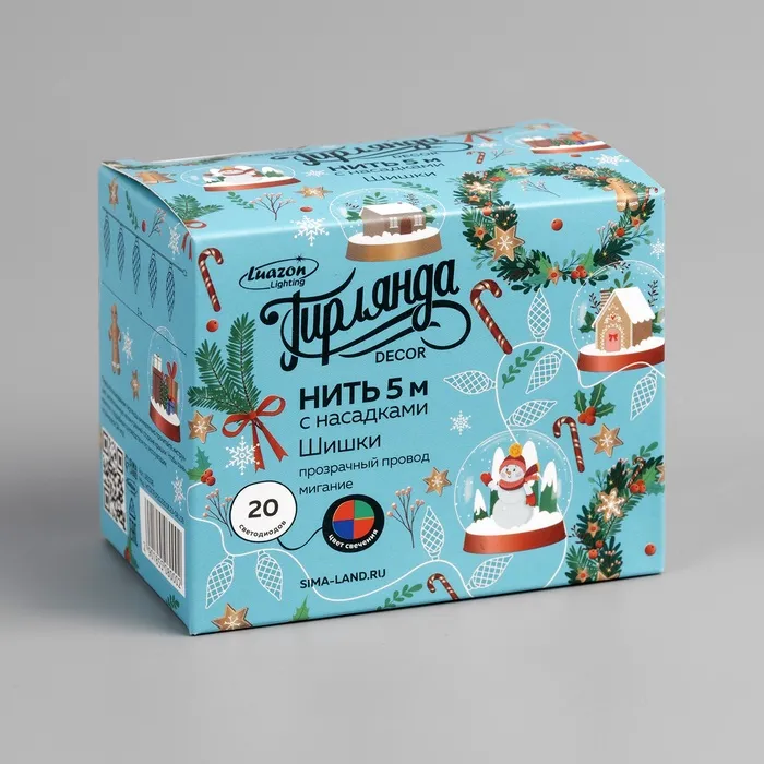 Гирлянда «Нить» 5 м с насадками «Шишки», IP20, прозрачная нить, 20 LED, свечение мульти (RG/RB), мигание, 220 В — Характеристики