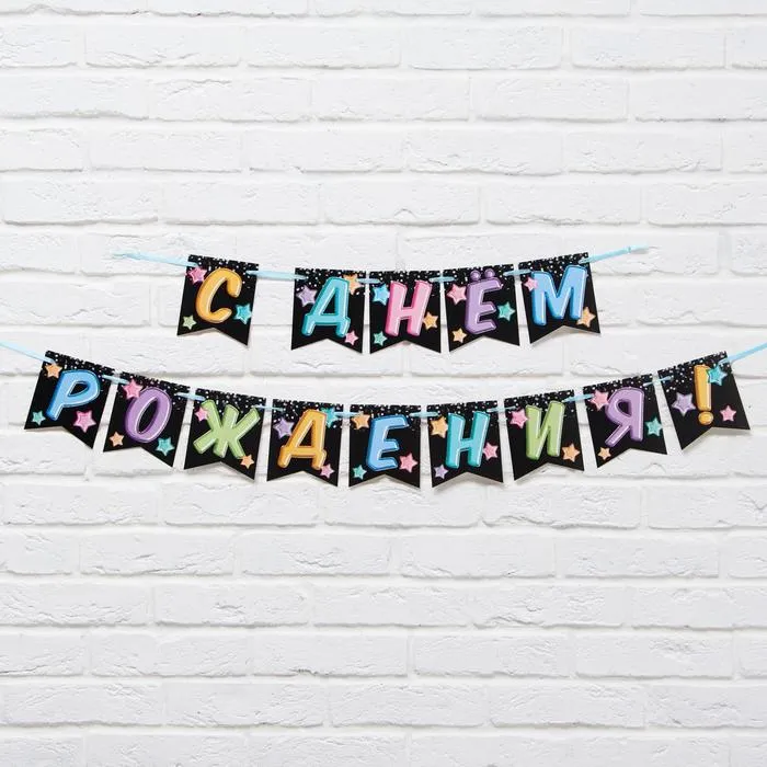 Длина гирлянды – 215 см., плотность картона – 200 гр/кв.м., размер флажков – 12 х 14 см.