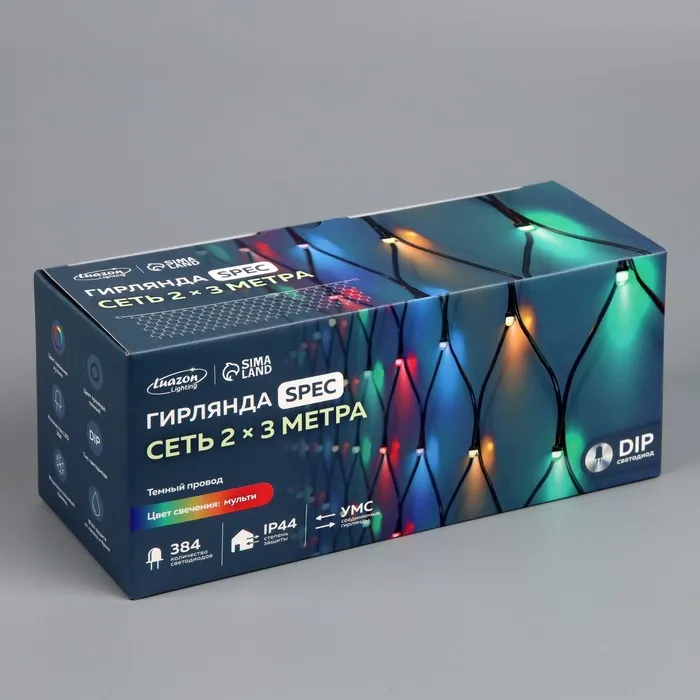 Гирлянда «Сеть» 2 х 3 м, IP44, УМС, тёмная нить, 384 LED, свечение мульти, 220 В — Характеристики