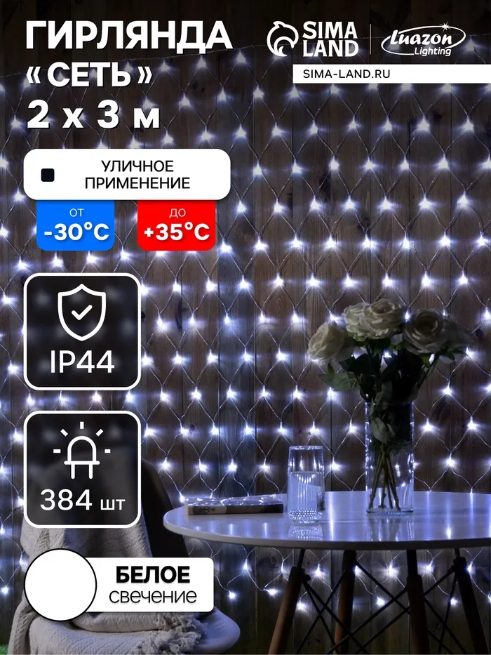 Гирлянда «Сеть» 2 × 3 м, IP44, УМС, прозрачная нить, 384 LED, свечение белое, 220 В — Характеристики