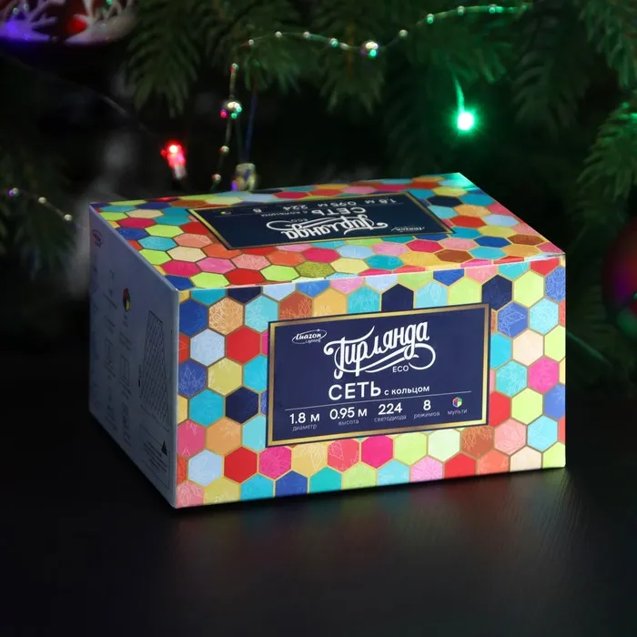Гирлянда «Сеть» d=1.8 м с кольцом на ёлку, IP20, тёмная нить, 224 LED, 8 режимов, 220 В, свечение мульти — Характеристики