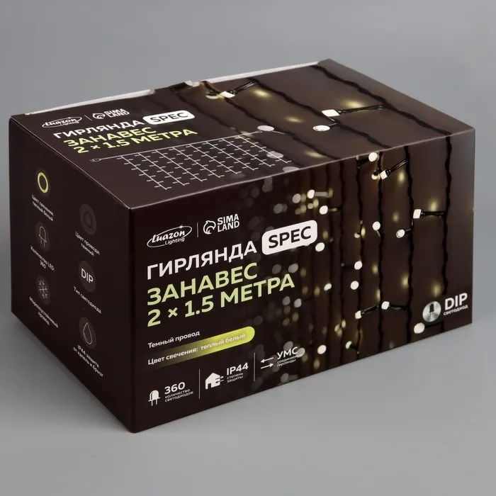 Гирлянда «Занавес» 2 × 1.5 м, IP44, УМС, тёмная нить, 360 LED, свечение тёплое белое, 220 В — Характеристики