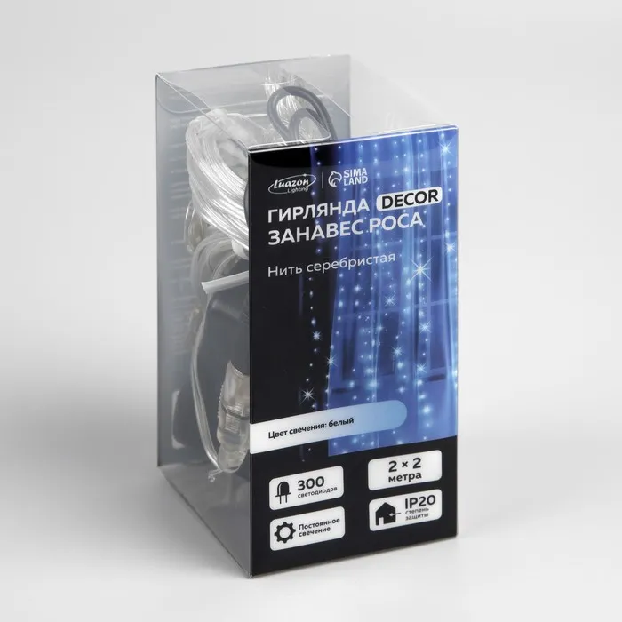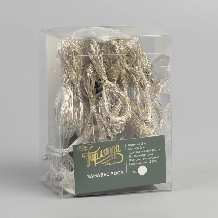 Гирлянда «Занавес» 2 × 2 м роса, IP20, серебристая нить, 300 LED, свечение белое, 12 В — Характеристики