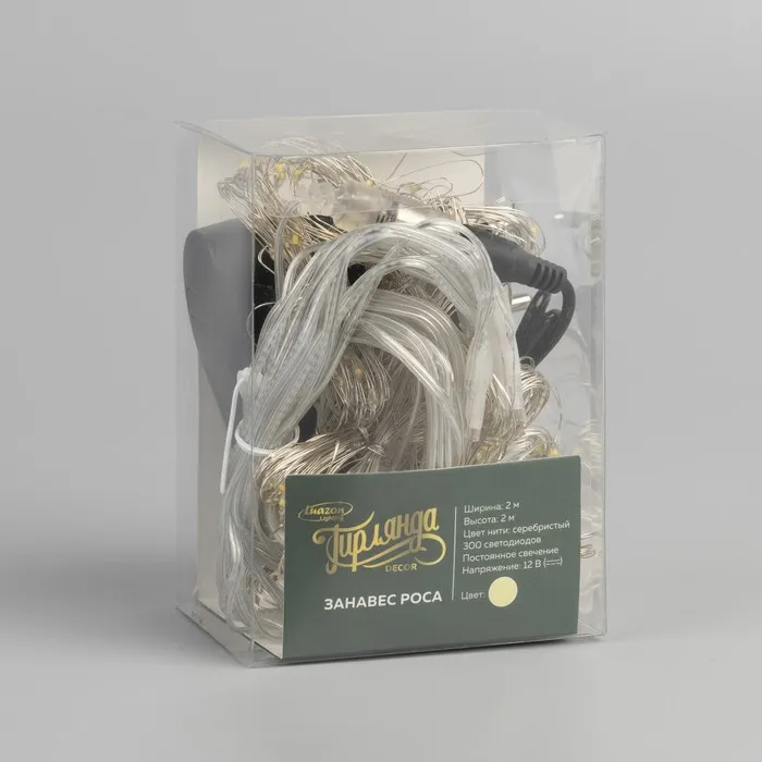 Гирлянда «Занавес» 2 × 2 м роса, IP20, серебристая нить, 300 LED, свечение тёплое белое, 12 В — Характеристики