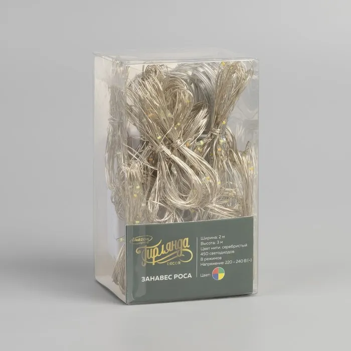 Гирлянда «Занавес» 2 × 3 м роса, IP20, серебристая нить, 450 LED, свечение мульти, 8 режимов, 220 В — Характеристики