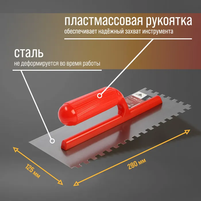 Гладилка ЛОМ, стальная, пластиковая рукоятка, зуб 8×8 мм, 125×280 мм — Характеристики