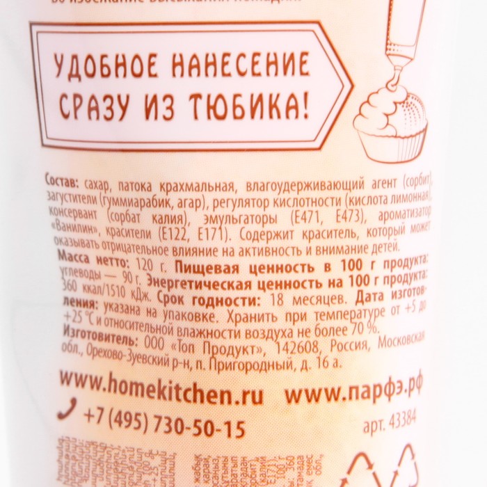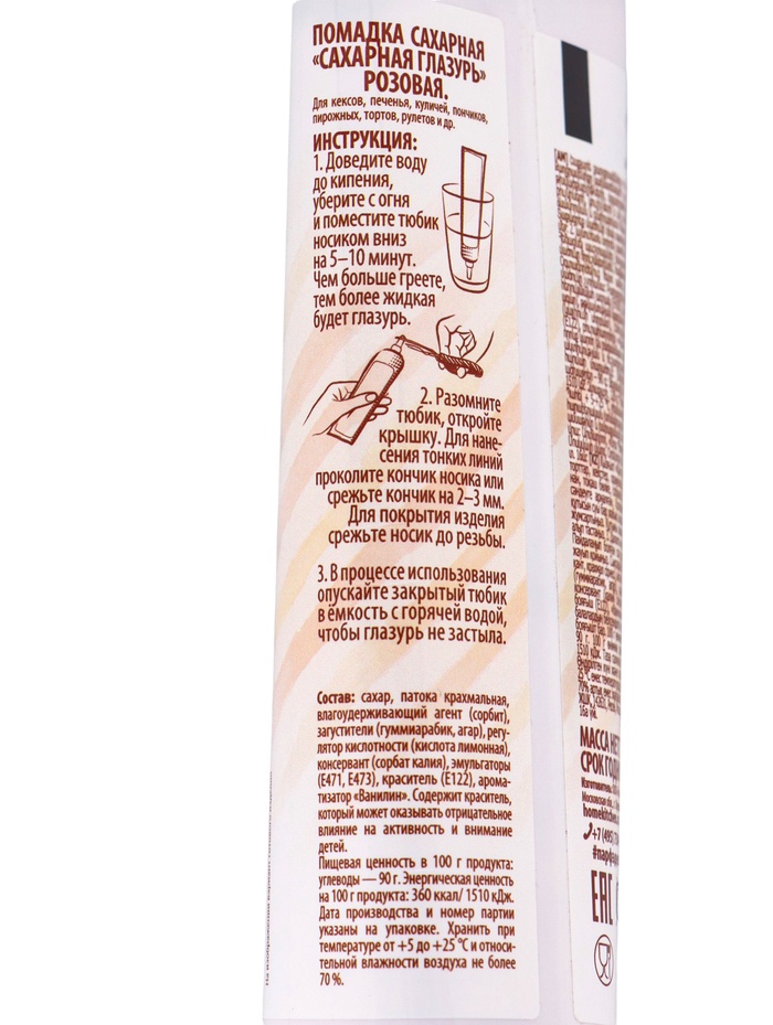 Глазурь сахарная — это идеальный глянцевый блеск, правильная консистенция, которая позволяет распределять глазурь аккуратно и равномерно по всей поверхности выпечки. Удобное нанесение сразу из тюбика!