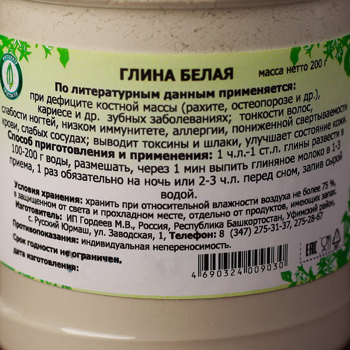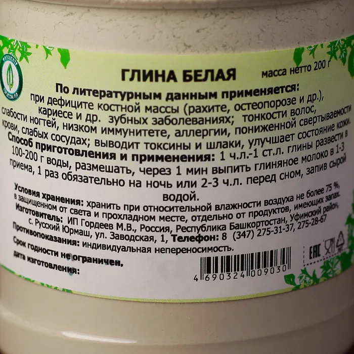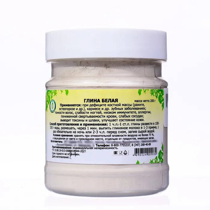 Глина белая для приема внутрь (каолиновая глина пищевая) – натуральное средство для очищения организма от вредных токсинов и шлаков. Глина белая лечебная рекомендуется при дефиците костной массы. Белая глина лечебная содержит в своем химическом составе кремний, цинк, марганец калий, кальций, азот и магний. Белая глина для приема внутрь применяется при рахите, остеопорозе, кариесе и других зубных заболеваниях, тонкости волос, слабости ногтей, низком иммунитете, аллергии, пониженной свертываемости крови, слабых сосудах. Каолиновая глина пищевая эффективна при аллергических реакциях, отравлениях, различных желудочно-кишечных болезнях. Можно использовать белую глину как косметическую, как маска для лица или волос. Белая глина будет полезна и подойдет для любого типа кожи. Белая глина косметическая омолаживает, удаляет омертвевшие клетки, сужает расширенные поры, осветляет пигментные пятна, уменьшает морщины.