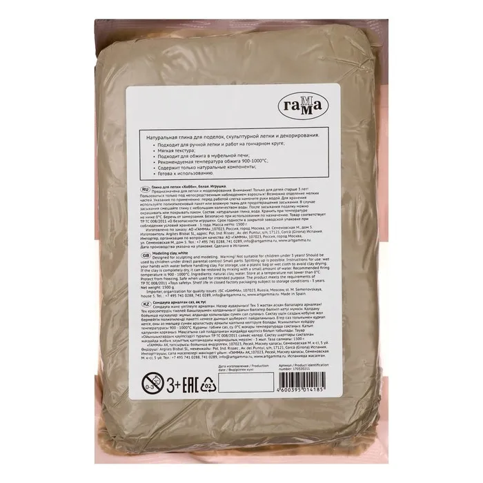 Глина натуральная для лепки 1500 г, белая, Гамма "Хобби", (подходит для обжига) вакуумированная /Испания/ — Характеристики
