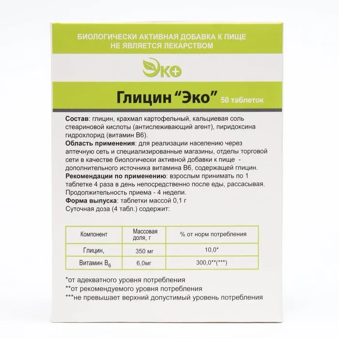 Глицин, крахмал картофельный немодифицированный (загуститель), кальция стеарат (эмульгатор), витамин В6.
