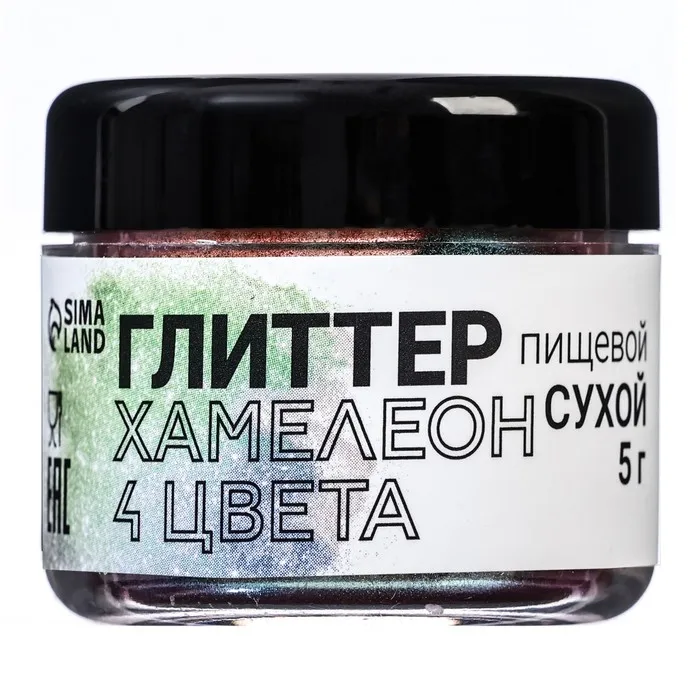 Глиттер-кандурин "Хамелеон" содержит в себе зелёный, синий и жёлтый и жёлто-зелёный цвета, что придает ему потрясающий оттенок. Пищевые глиттеры не имеют вкуса и запаха, а значит не меняют вкуса и аромата готовых кондитерских изделий. Данный продукт плотный и отлично покрывает как твердые поверхности, так и изделия с жидкой текстурой. Подойдет для продуктов любой температуры. Краситель на 100% съедобен. Окрашивайте готовые изделия, напитки, элементы декора, а также глазурь, айсинг, желе, мармелад, карамель.