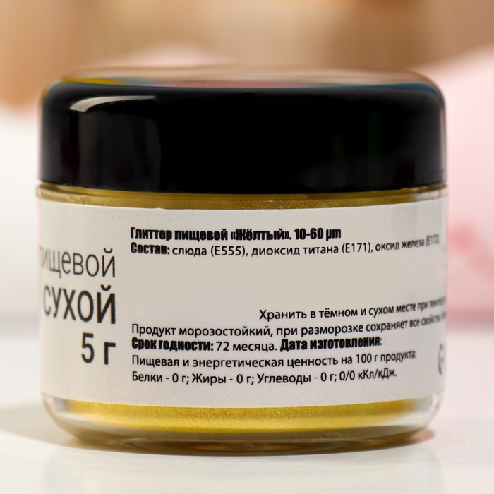 Глиттер кандурин пищевой КондиМир "Желтый" (фракция 10-60 µm, 5 г) — это идеальное решение для создания яркого и эффектного декора ваших кулинарных произведений. Этот блестящий элемент предназначен для тех, кто хочет добавить изюминку и эстетическую привлекательность к своим десертам, выпечке и кондитерским изделиям.
