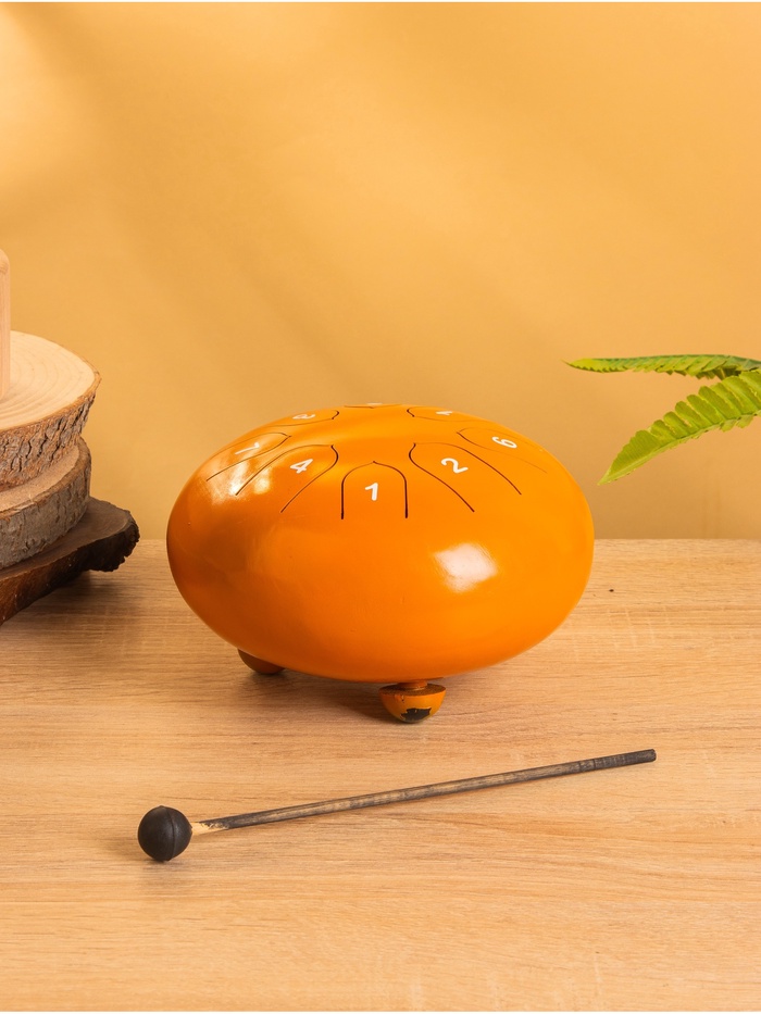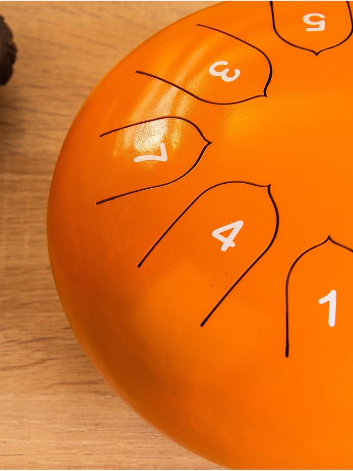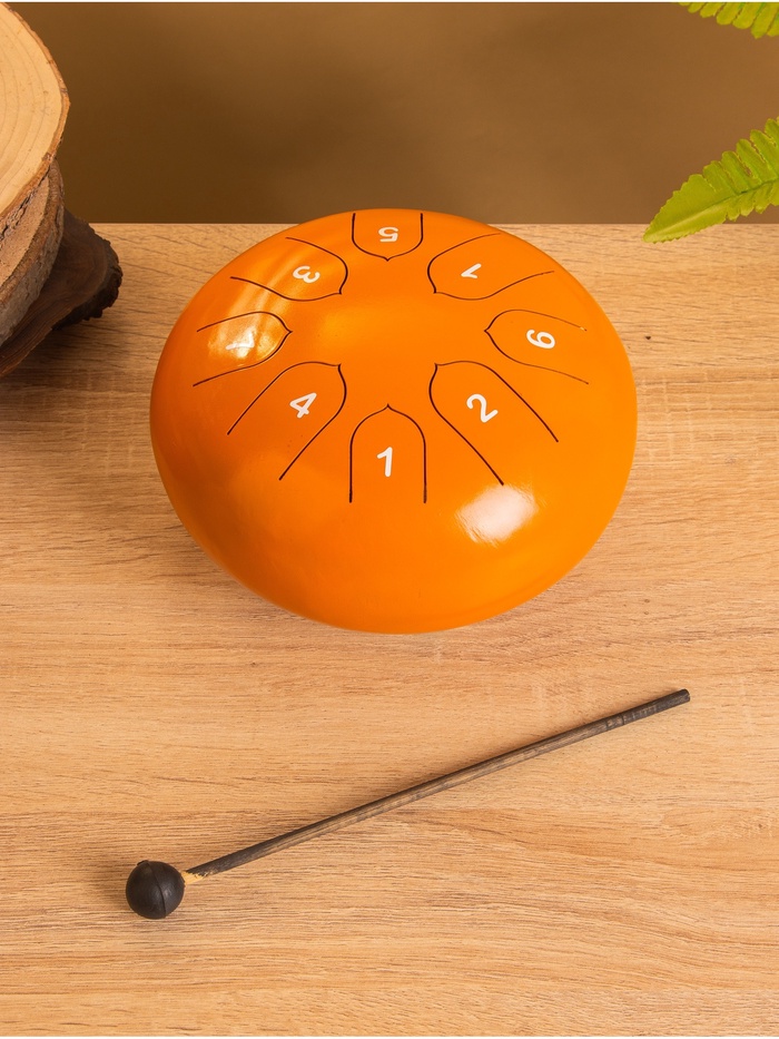 Сувенирный музыкальный инструмент глюкофон, изготовленный из нержавеющей стали, привлекает внимание своим ярким оранжевым цветом. Диаметр в 16 см делает его компактным и удобным для транспортировки. В наборе идут палочки и чехол, что позволяет сразу начать использование. Глюкофон оснащен 7 лепестками, обеспечивая насыщенное и мелодичное звучание.