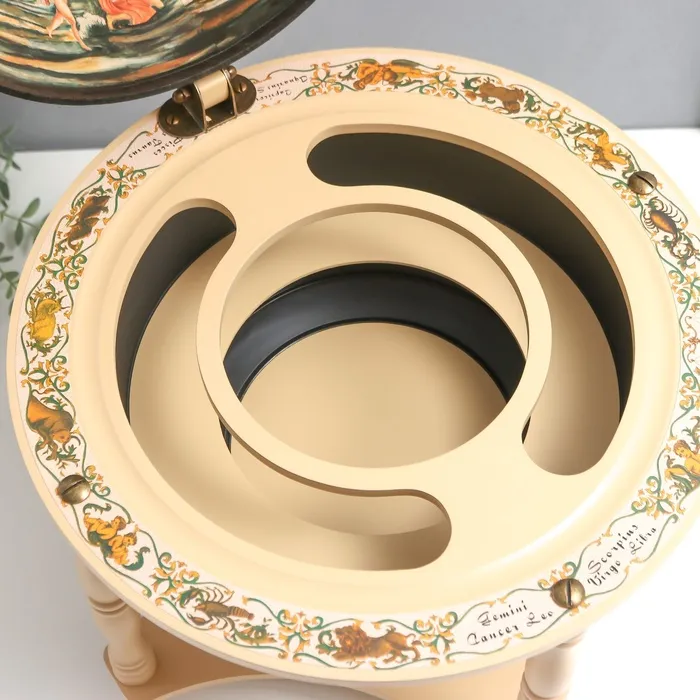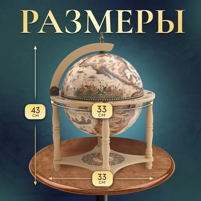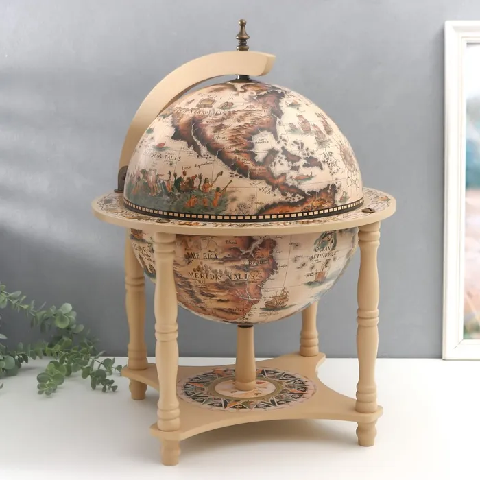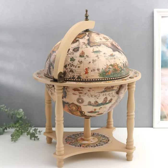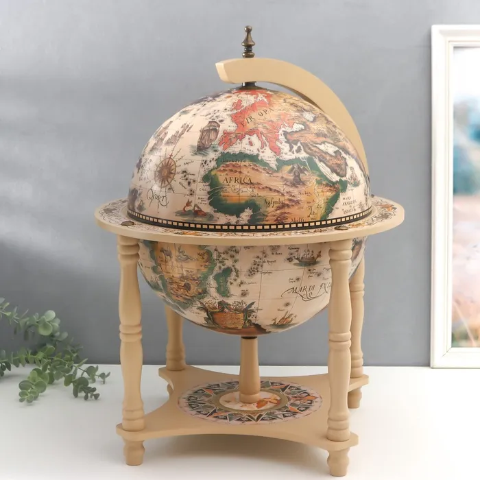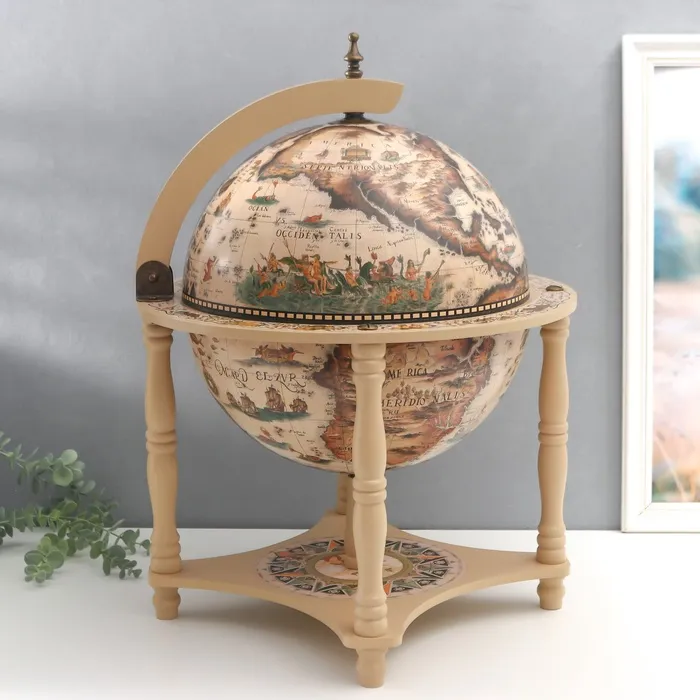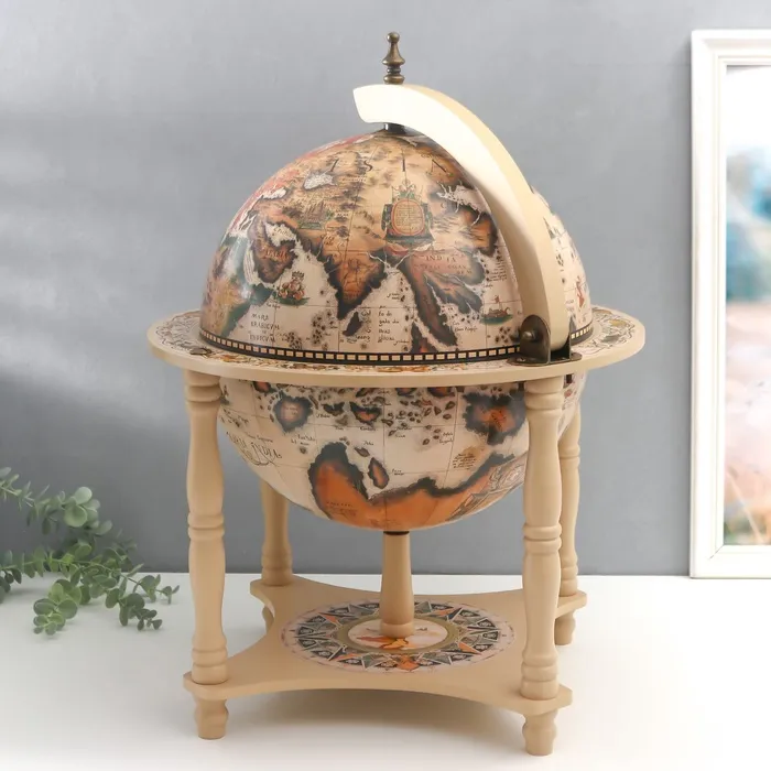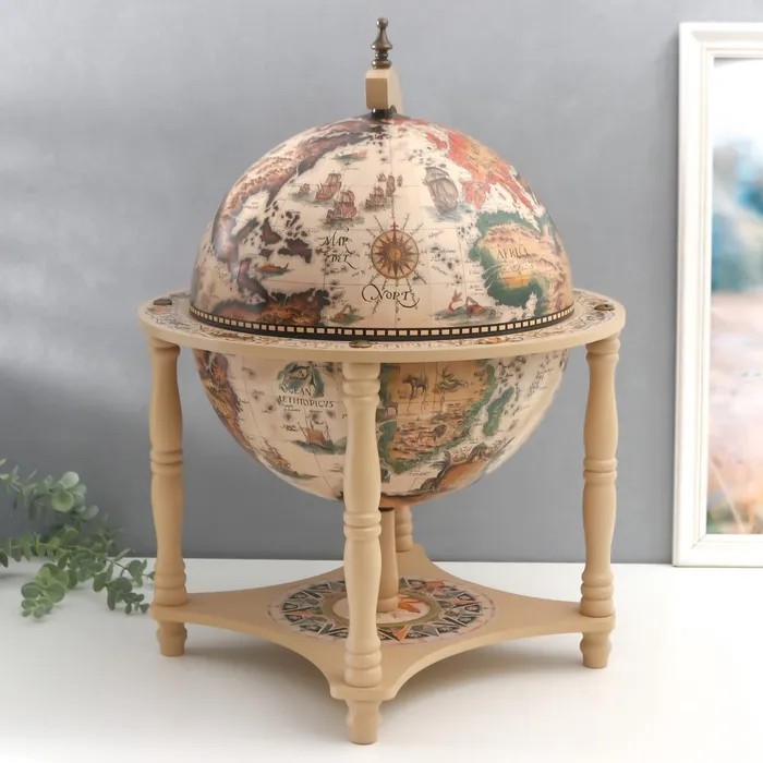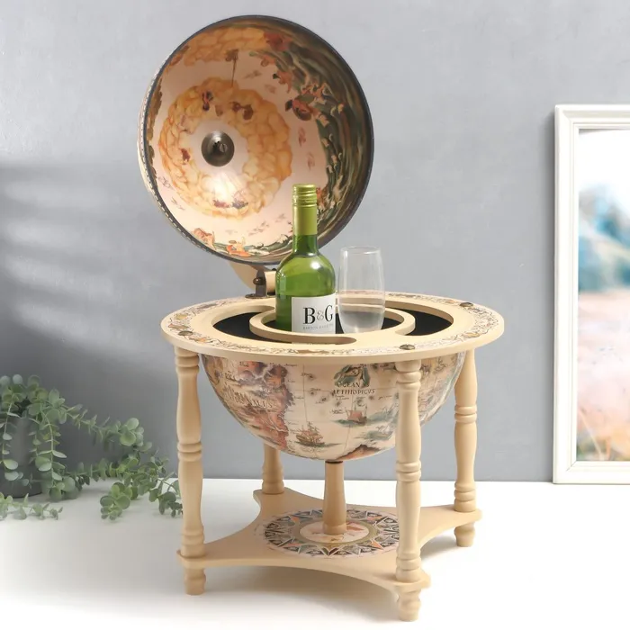 Предмет, который навеет мысли о жарких странах, соленом морском бризе и неизведанных городах. Элегантный глобус-бар на изящной подставке с витыми ножками - стильное и статусное украшение как домашнего, так и офисного интерьера. Он будет как нельзя кстати, если вам захочется поднять с коллегой или партнером символический бокал шампанского за успешное окончание сделки или выпить по глотку крепкого коньяка со старыми добрыми друзьями, ведь внутри глобуса скрывается мини-бар, в который всегда можно поставить бутылки с алкогольными или прохладительными напитками.