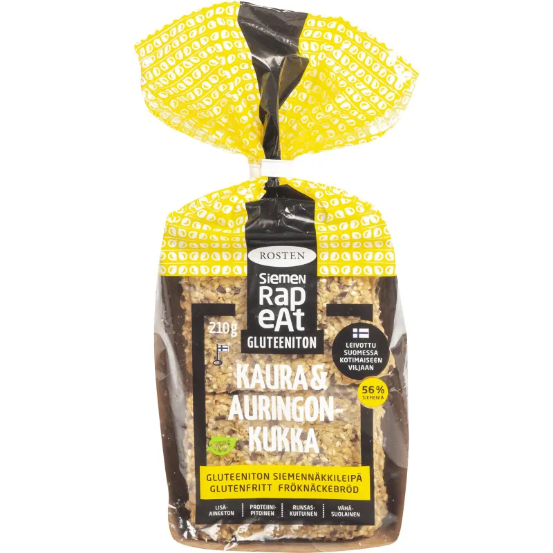 Вкусные безглютеновые хрустящие хлебцы от Rosten! Вариант "Овес и Подсолнух" богат белком и является отличным источником клетчатки. Продукт содержит более 56% семян. Подходит для веганов и произведен в Финляндии. В упаковке 10 шт. / 210 г.