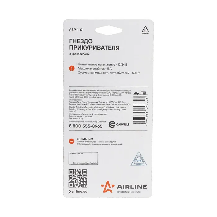 Гнездо прикуривателя Airline ASP-1-01, с крокодилами — Характеристики