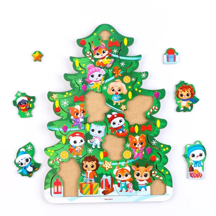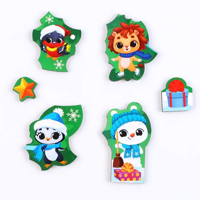 Сборка фигурок в рамку тренирует логическое и пространственное мышление. Яркие элементы в виде новогодних персонажей делают процесс увлекательным, а деревянные детали развивают тактильные ощущения. Игра также помогает ребёнку учить названия предметов и считать, что делает её универсальным инструментом для развития.