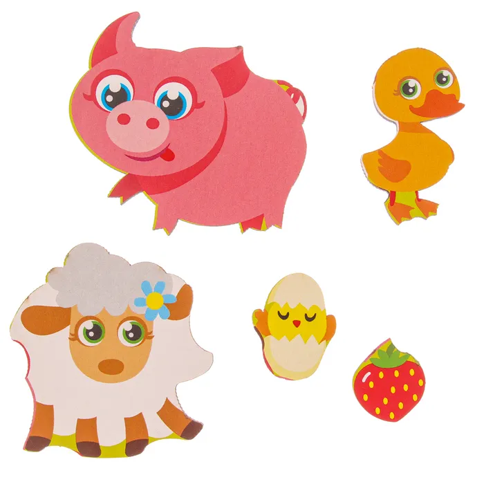 Определите с малышом положение фигурок и попросите ребёнка назвать каждого персонажа. Устройте зверят на предназначенные им места — в этом помогут цветные силуэты на основании игрушки.