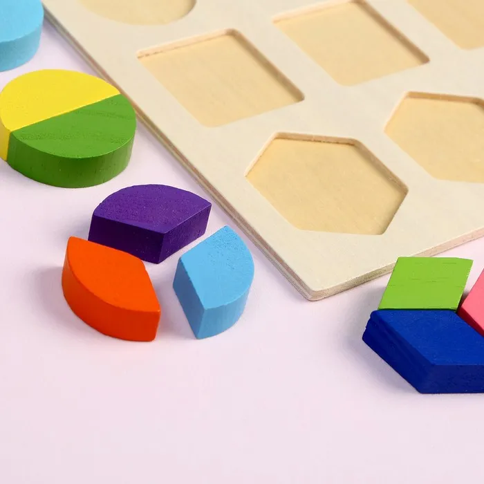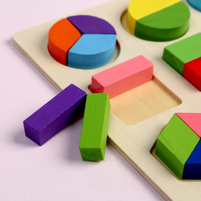 Головоломка «Фигуры. Дроби и целое», 3×3 см, до 1/3 создана по методике Монтессори, направленной на развитие тактильных ощущений. Особенность этого метода в том, что взрослый не вмешивается в творческий процесс игры. То есть малыш изучает игровой материал, цвета элементов, формы фигур и сравнивает их самостоятельно. Кроха сам выбирает дидактический материал, из которого будет творить, а также продолжительность и ритм занятий.