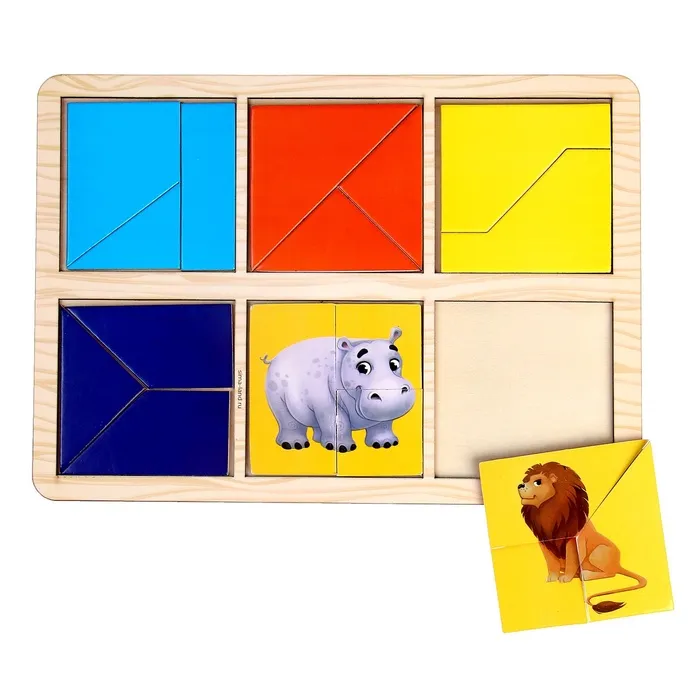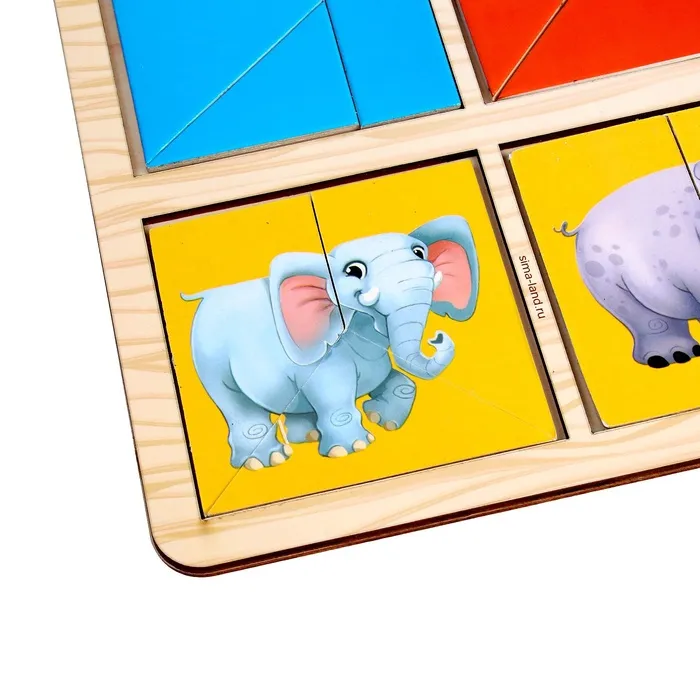Задача малыша - собрать квадраты из цветных элементов: треугольников, прямоугольников и других фигур в рамку. Сначала можно собирать изображения с животными,а затем однотонные картинки.