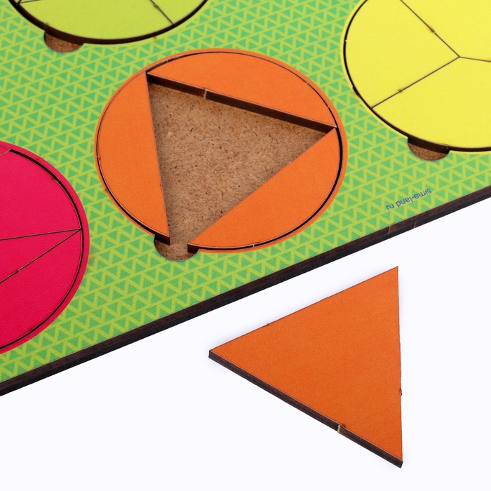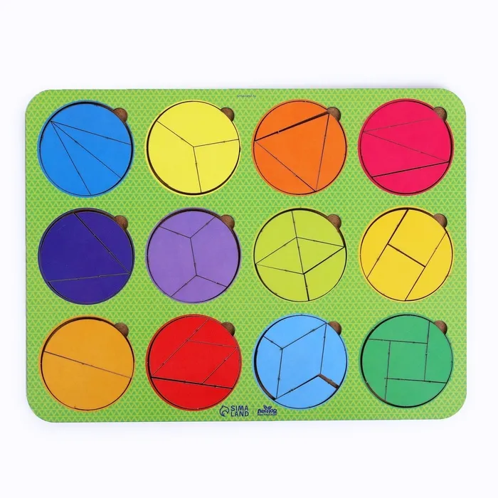 Задача ребёнка — в процессе игры с помощью фигур сложить узор в виде круга и таким образом заполнить отверстия в деревянной рамке.