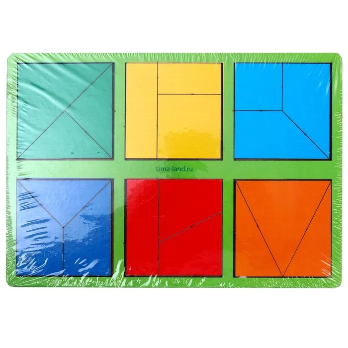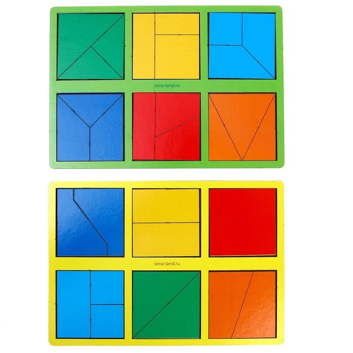Задача малыша - собрать 6 квадратов из цветных элементов: треугольников, прямоугольников и других фигур.