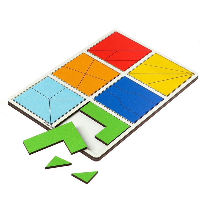Задача малыша - собрать 6 квадратов из цветных элементов: треугольников, прямоугольников и других фигур.