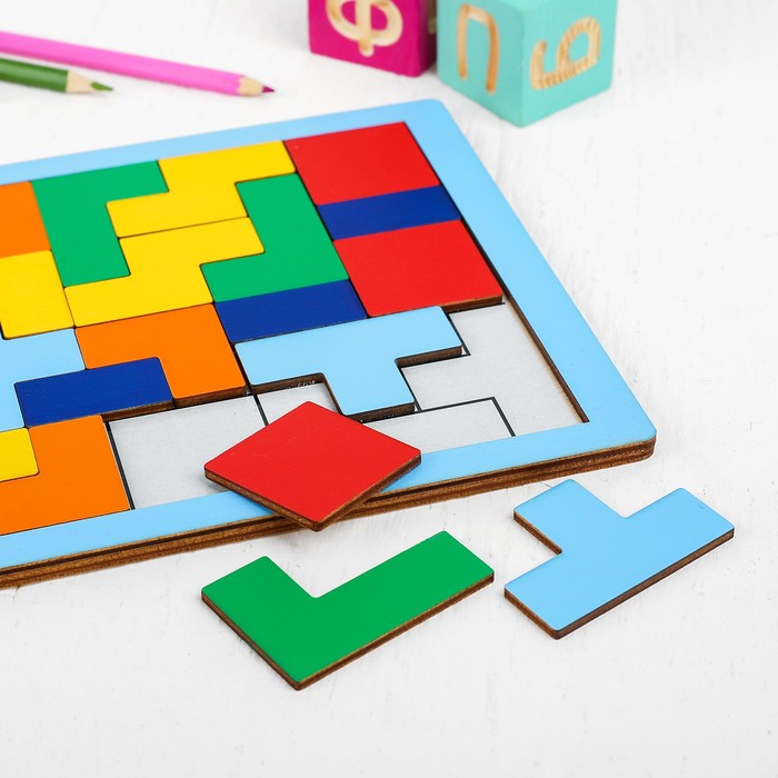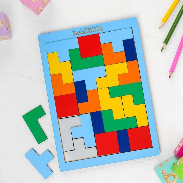 Головоломка-конструктор с подсказкой выполнена в виде рамки-вкладыша с фигурками разных форм и цветов.