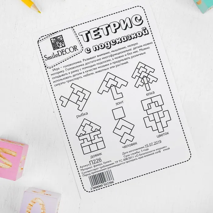 Игра-головоломка развивает внимание, мышление, мелкую моторику. Головоломка достаточно многофункциональна: детали можно складывать в рамку с помощью подсказки, а можно и без нее.
